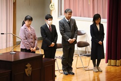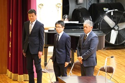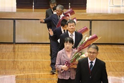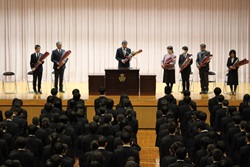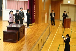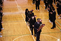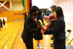 3月25日(水)に「終業式・離退任式」が行われました。校歌斉唱の後、校長先生のお話をお聞きし、教務・進路指導・生徒指導の各主任の先生方から一年間の総括等を報告していただきました。終了後、学年集会とHRを挟んで「離退任式」が行われました。退任される1名の先生と離任される6名の先生方からご挨拶をいただきました。生徒会長がお礼の言葉を贈り、その後お世話になった先生方へ花束贈呈をしました。名残は尽きませんが、全校生徒が先生方をお送りしました。