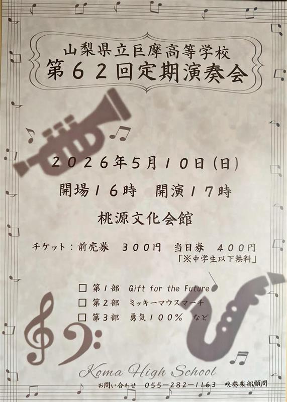 山梨県立巨摩高等学校 > 部活動 > 吹奏楽 > 「巨摩高校吹奏楽部第62回定期演奏会」を開催します。 2026年4月15日カテゴリー: お知らせ 生徒会 部活動 吹奏楽 「巨摩高校吹奏楽部第62回定期演奏会」を開催します。 令和8年5月10日(日)に「巨摩高校吹奏楽部第62回定期演奏会」を開催します。 会場は桃源文化会館で、17時開演予定です。 吹奏楽曲をはじめ、光GENJI の「勇気100%」やMrs. GREEN APPLEの「点描の唄」など皆様きき馴染みがある曲も演奏します。 吹奏楽にあまり馴染みが無い方でも楽しめるよう、演奏以外のパフォーマンスも準備して皆様をお待ちしております。 ☆チケットや演奏会に関するお問い合わせ☆ ℡:055-282-1163 巨摩高等学校吹奏楽部顧問まで