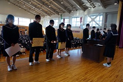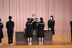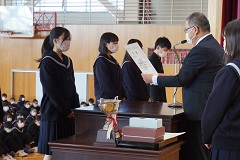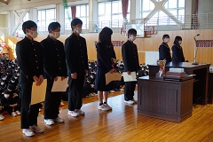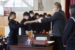 12月24日(金)、校納式と2学期終業式が行われました。校納式では、陸上競技部、弓道部、テニス部、音楽部、筝曲部、吹奏楽部、家庭クラブ、バドミントン部、体操、芸文祭テーマ、読書感想文、科学写真など、各種大会に出場した生徒たちの賞状やトロフィーなどが納められ、その健闘を称えて、全校生徒から大きな拍手が送られました。